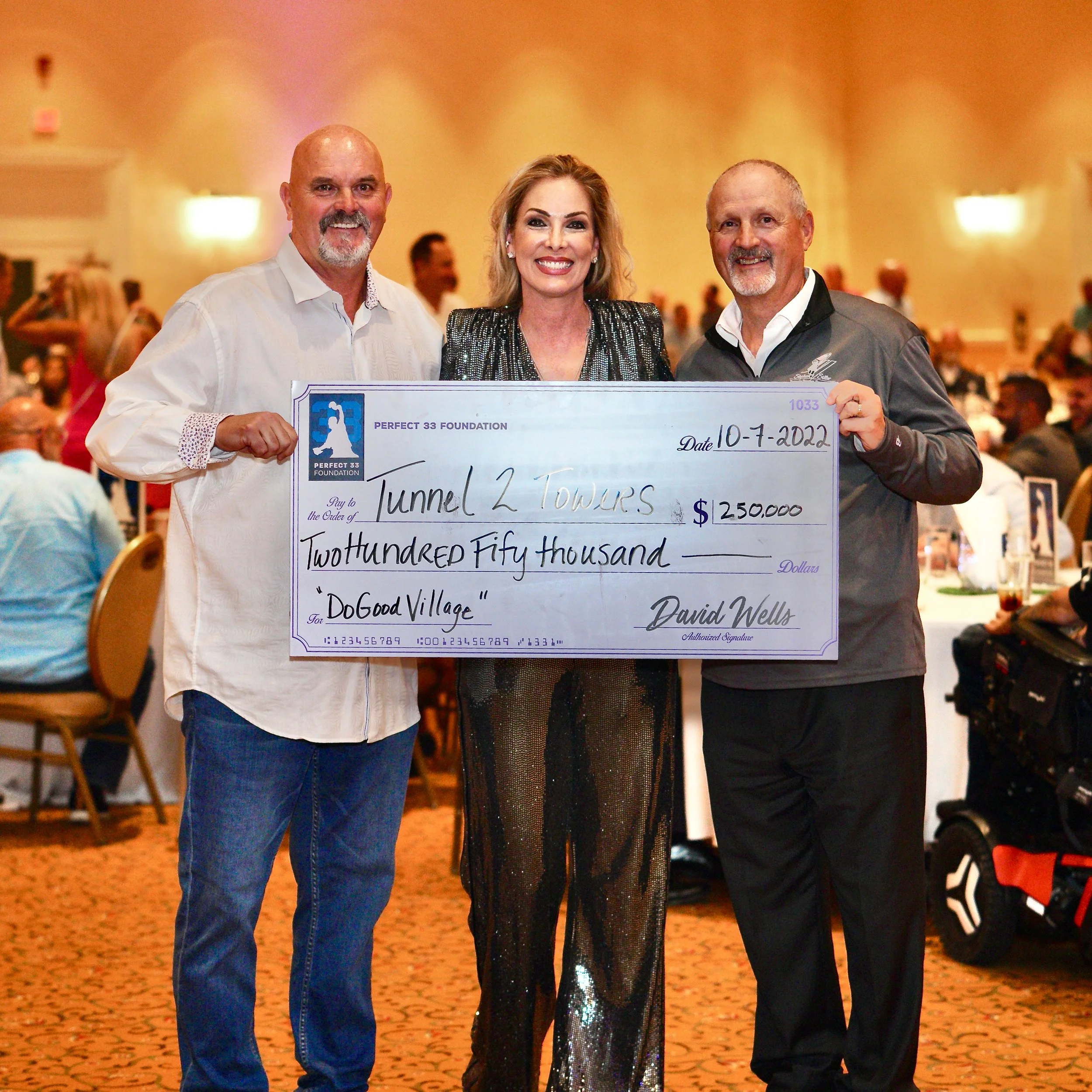 “David and Nina Wells, and the Perfect 33 Foundation have been extraordinary partners of the Tunnel to Towers Foundation over the past three years, having raised nearly $1,000,000 to be used for the T2T Let Us Do Good Village in Land O’ Lakes, Florida. The Tunnel to Towers Foundation thanks the Wells family and Perfect 33 Foundation for their efforts to serve veterans and fallen first responders and Gold Star families across the nation”.